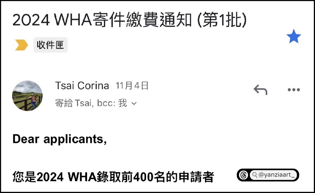 這個好像每年不一定,以我個人的經驗為主,我是在登記的三天後,2023.11/4(六),收到蔡小姐的來信,上面寫著:「您是2024 WHA錄取前400名的申請者 第1批」!