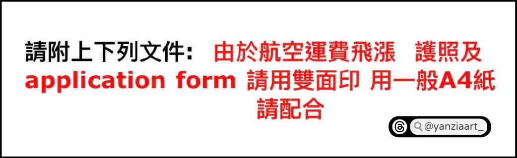 由於航空運費飛漲,「申請表格」及「護照」 請用雙面列印,用一般A4紙。