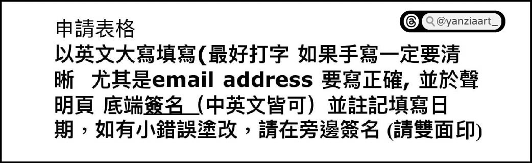 表格以英文大寫大寫填寫(最好打字,如果手寫一定要清晰 尤其是email address要寫正確),並於聲明頁 底端簽名(中英文皆可)並註記填寫日期,如有小錯誤塗改,請在旁邊簽名(請用一般A4紙雙面列印)