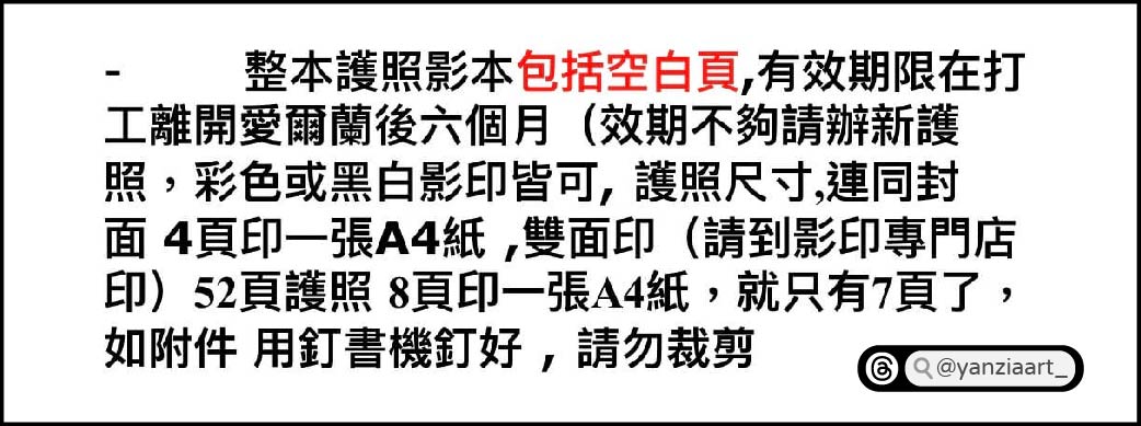 整本護照影本,包括空白頁、封面封底,有效期限在打工離開愛爾蘭後六個月(效期不夠請辦新護照)。