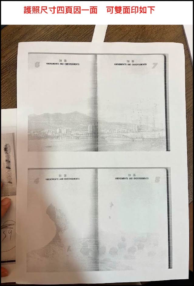 我個人是直接在公司把護照整本掃描起來(包含封面封底、空白頁),之後再用Indesign將4頁護照排成一頁A4紙,下列印時選擇雙面列印即可。