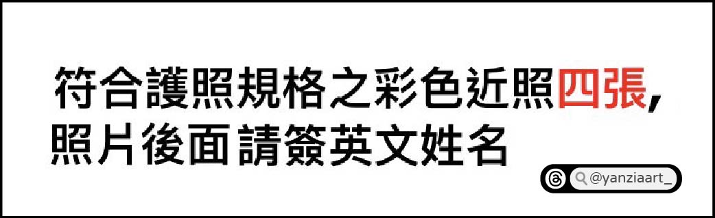 符合護照規格(2吋)之彩色近照4張,照片後面請簽英文姓名(同護照上的英文姓名)。