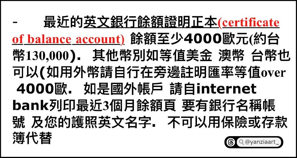 最近的英文銀行餘額證明正本(certificate of balance account),至少4000歐元(約台幣130,000),其他幣別如等值美金、澳幣、台幣也可以(如用外幣請自行在旁邊註明匯率等值over 4000歐)如是國外帳戶,請自internet bank列印最近3個月餘額頁,要有銀行名稱帳號及您的護照英文名字,不可以用保險或存款簿代替。