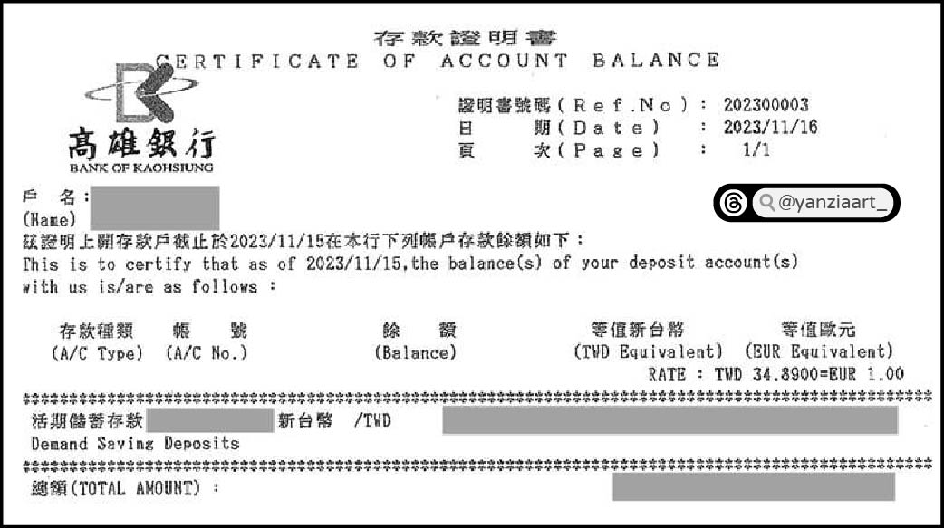 因薪轉戶是高雄銀行的關係,我直接到高銀跟櫃台說想申請英文財力證明,要是歐元的,然後櫃檯就會幫你用了,我印了兩份,第一份50$,第二份+20$,總共花了70$手續費。
