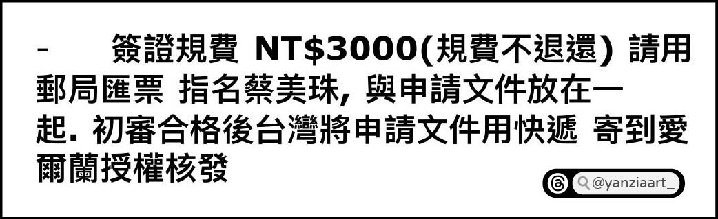 簽證規費NT$3000(規費不退還),請用郵局匯票,指名蔡美珠,與申請文件放在一起,初審合格後台灣將申請文件用快遞寄到愛爾蘭授權核發。