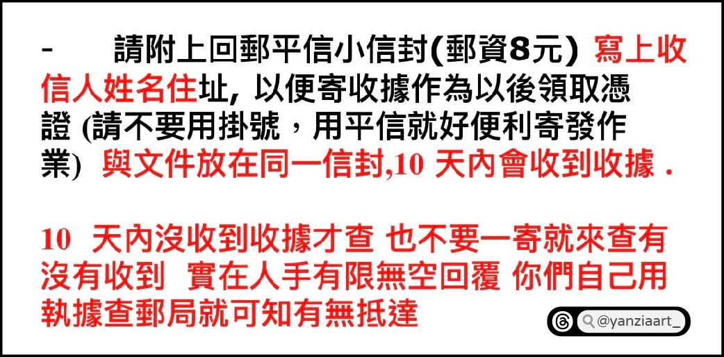 回郵平信小信封(郵資9元),寫上收信人姓名住址(就是你自己的姓名住址),以便寄收據作為以後領取憑證(請不要用掛號,用平信就好便利寄發作業)與文件放在同一信封,10天內會收到收據。