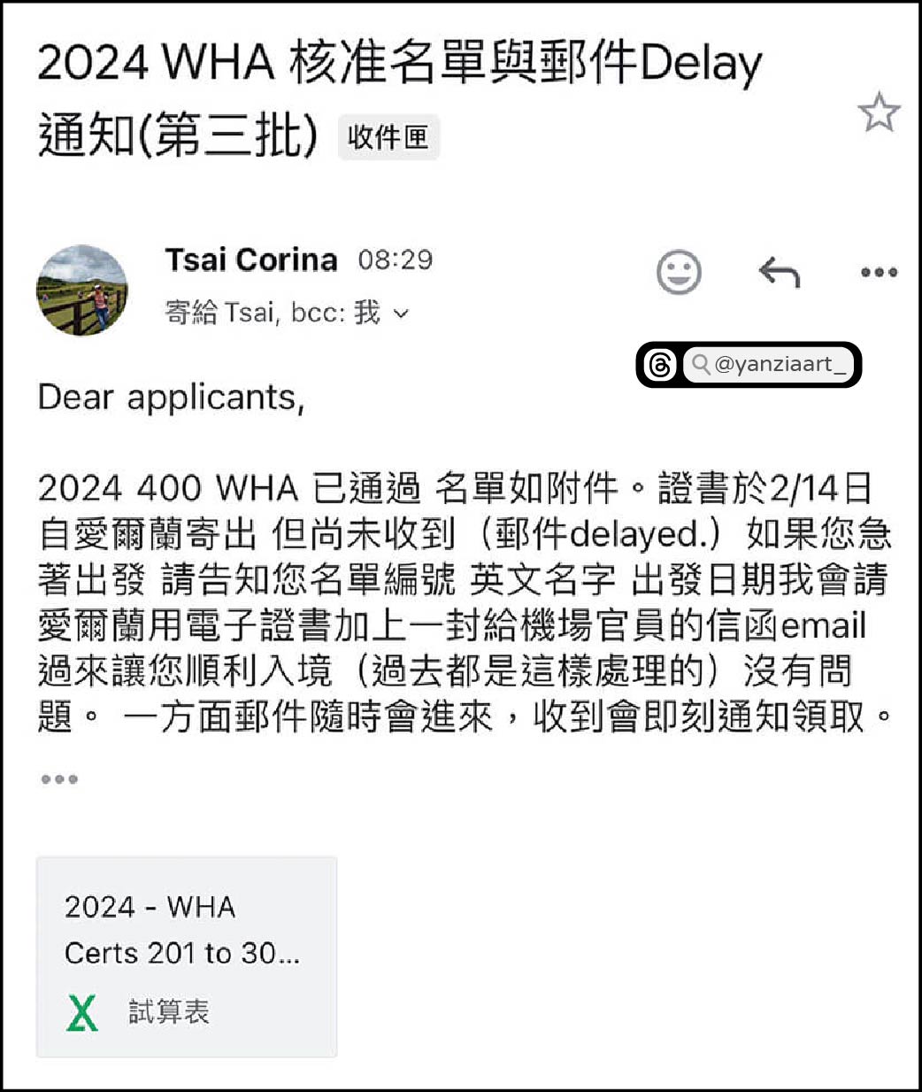 【隔年3月15日】:簽證Delay通知