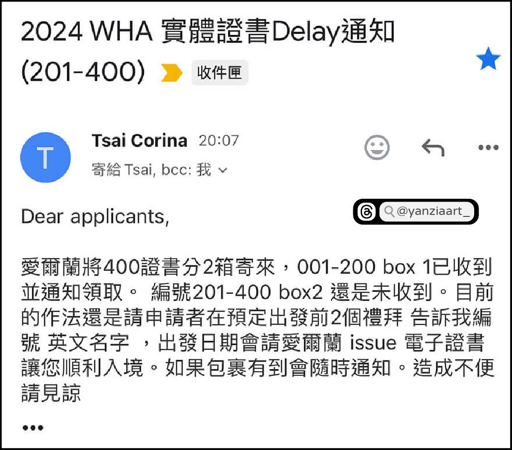 在2024年3月15(五),下班後的晚上八點左右,收到簽證delay通知!第201~400人的簽證依然未收到!而我雖然搶簽證時是搶到第一批,但寄到愛爾蘭後被打亂了,變成第三批!所以還是沒收到實體簽證…,而我機票買在4/18,來不及就要用電子簽證入境了!